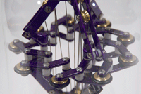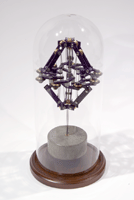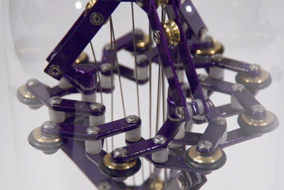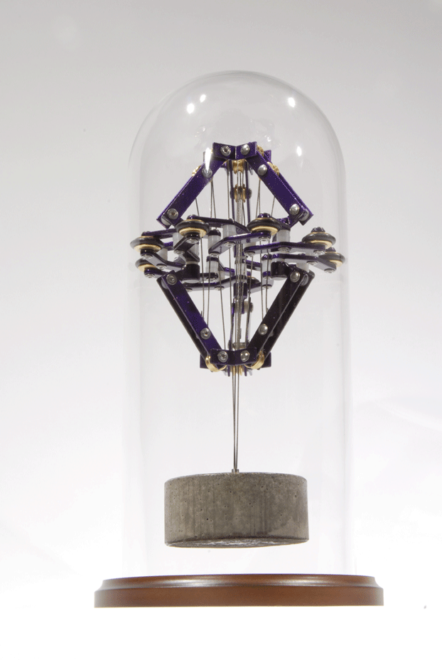 Piece is a counterweight driven mechanism that wedges itself into the inside of a cavity (the glass dome in this case), suspending itself.