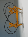 Piece is installed on drywall wall. It has centrally located springs that use bicycle brake lines to carry tension of springs to the outer mechanisms. Outer mechanisms have points that when tensioned simultaneously gently dig into wall surface.